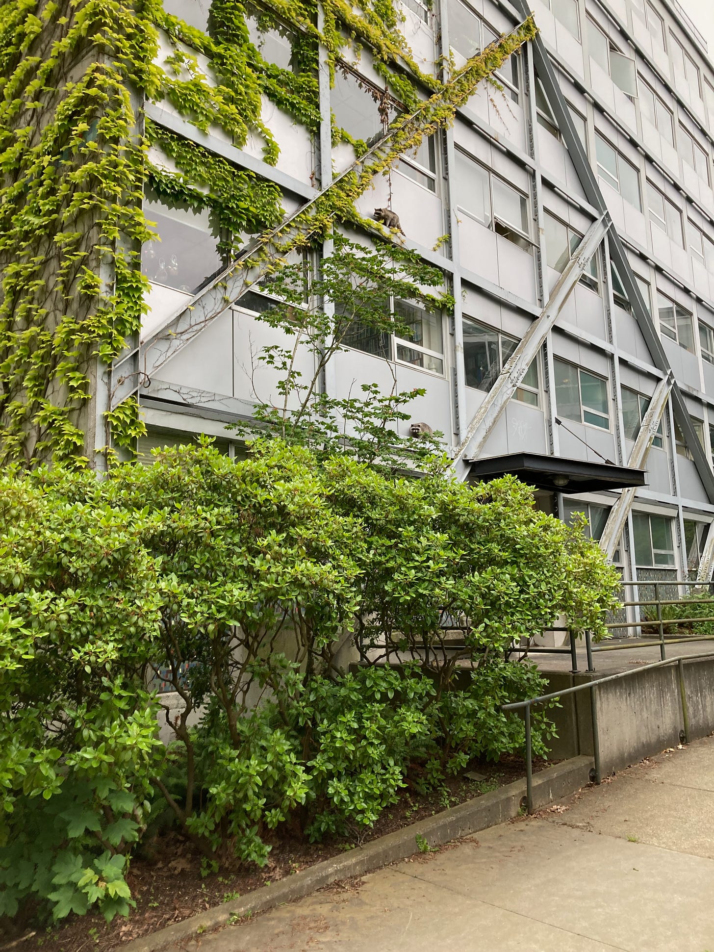 These aren’t the only animal neighbours on campus. There are quite a few dozen racoons about. If one is out in the early morning or around dusk you might run into a rollicking band of racoons. I’ve seen them in parking garages, along the hedges, in fountains and pools, and even climbing up the side of the Neville Scarfe Building.