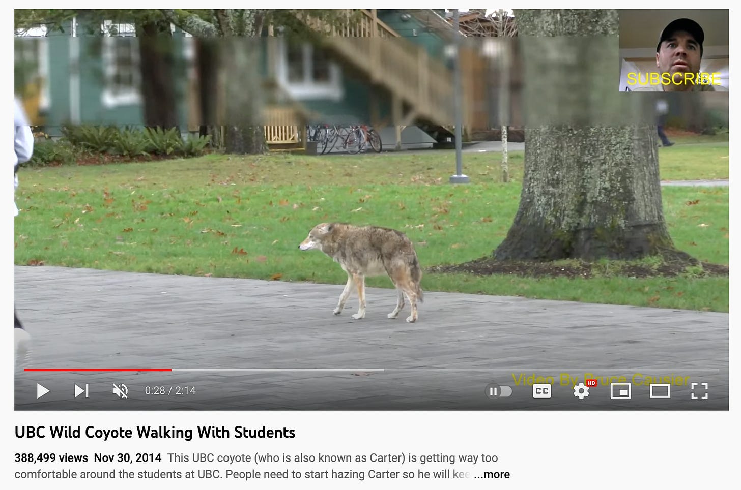 An earlier coyote, dubbed Carter, hunted squirrels on campus. ‘Carter’ even ended up with his own facebook page or two. Carter was far less concerned by humans than is Kip.