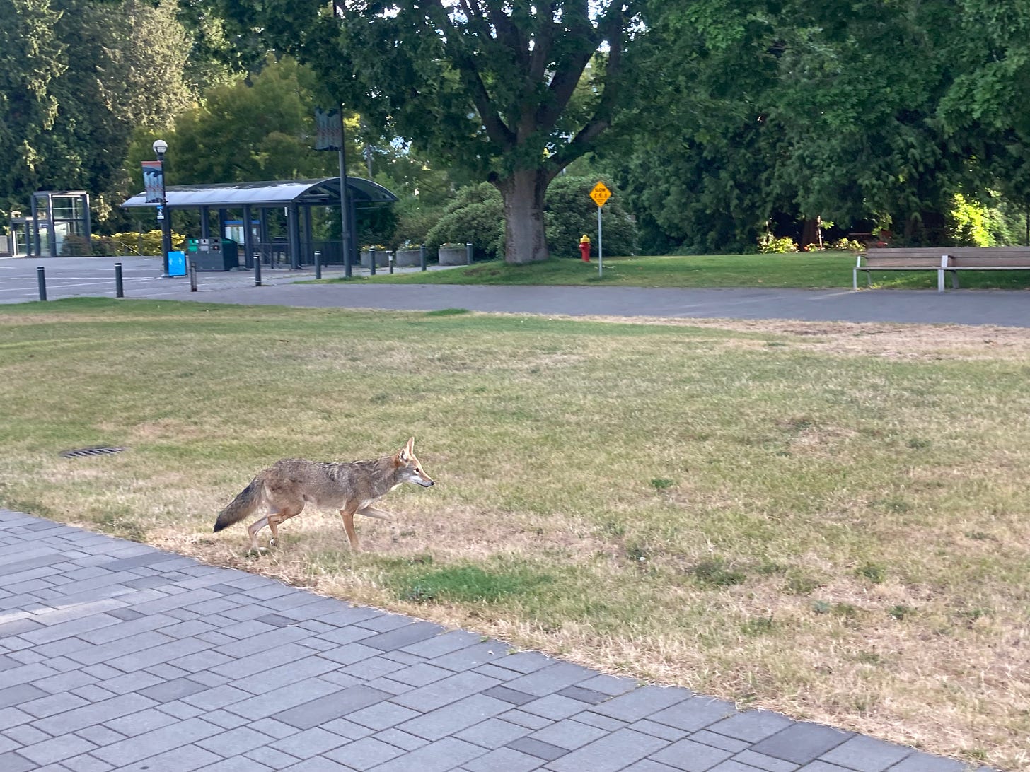 Thanks for writing about the fur-people with whom we share our campus! Kip is one of two coyote brothers who were born on campus in 2020; he's the one with the gimpy leg, which seems to have healed, though you'll note some residual stiffness (look at his gait and watch the left rear leg). That might be one reason he is more habituated to people: he's less able to hunt successfully and more dependent on human-generated food.