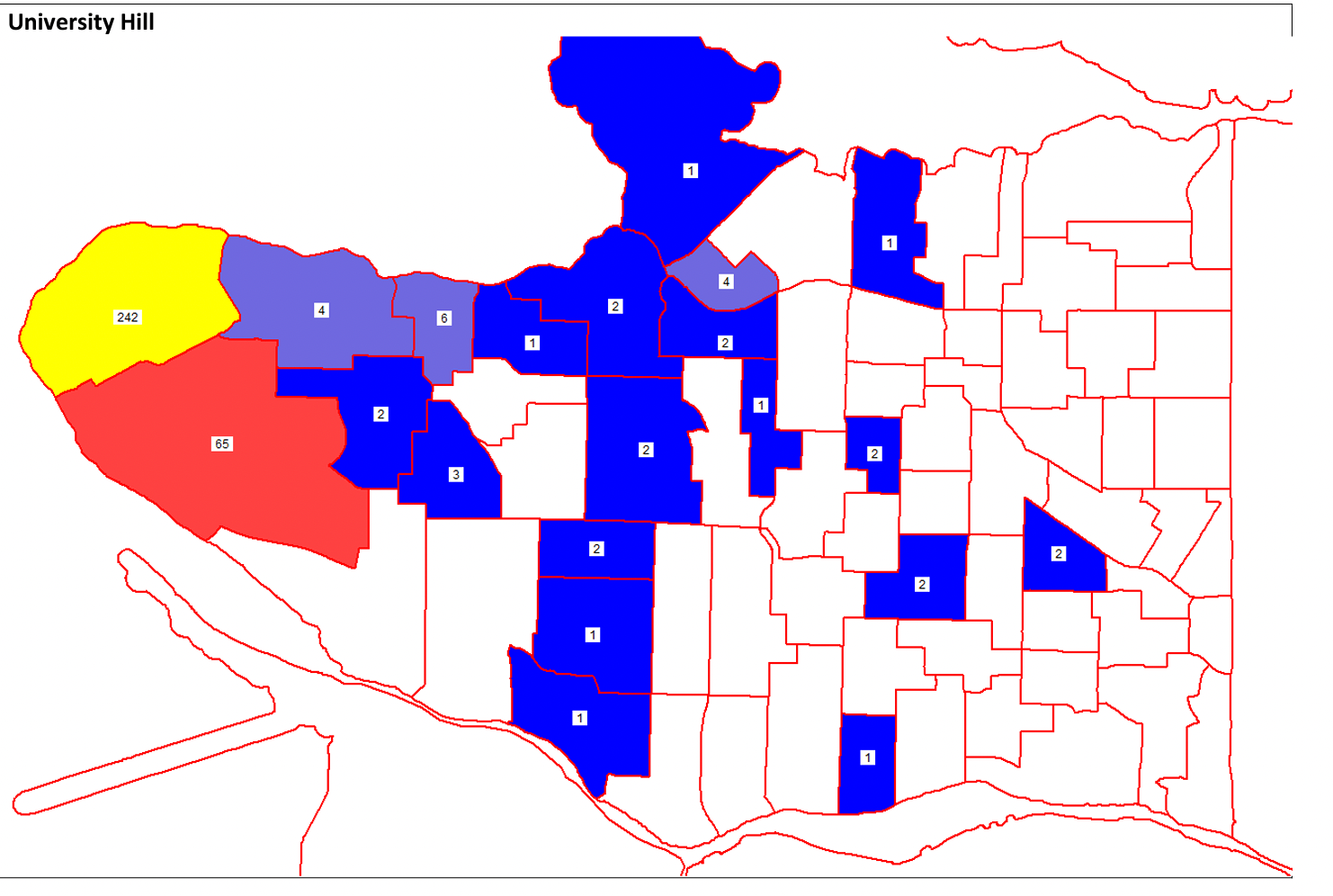 Mary (not her real name) is a single mother with an elementary school child. Mary works for UBC and in the fall of 2021 moved into a faculty staff rental building on campus. She had previously lived on campus and her child had attended one of the local area schools at that time. Thinking it would be straight forward, Mary went to sign her child up for school and was turned away. “We have no space for you” the school told her. “We’ll put you on a waiting list.” Meanwhile she was sent to one of the peripheral schools that border the eastern edge of Vancouver (Bayview, Queen Mary, Queen Elizabeth, and Southlands). All of these schools are between 4 and 8 km from her home.