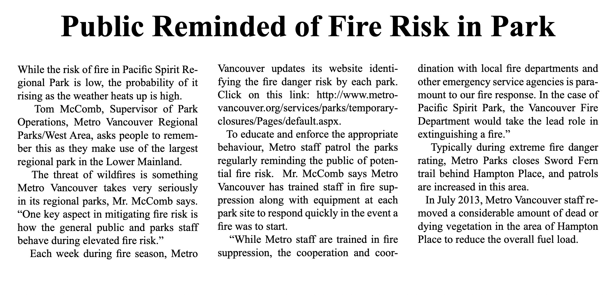 From an operational perspective we have placed “no smoking” signage on the trails adjacent to forested areas, and we liaise with Metro Parks, UBC Fire, and any other agencies as required.